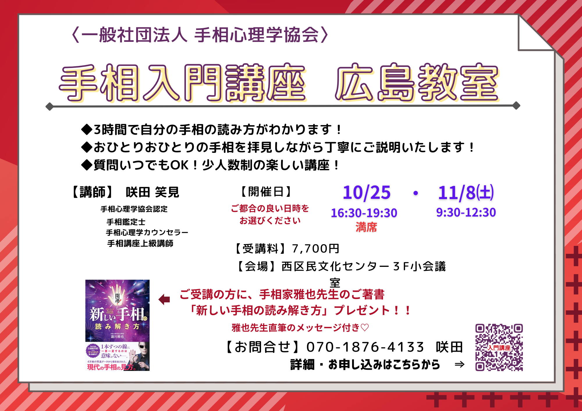 手相心理学協会 手相入門講座 広島教室 10月・11月